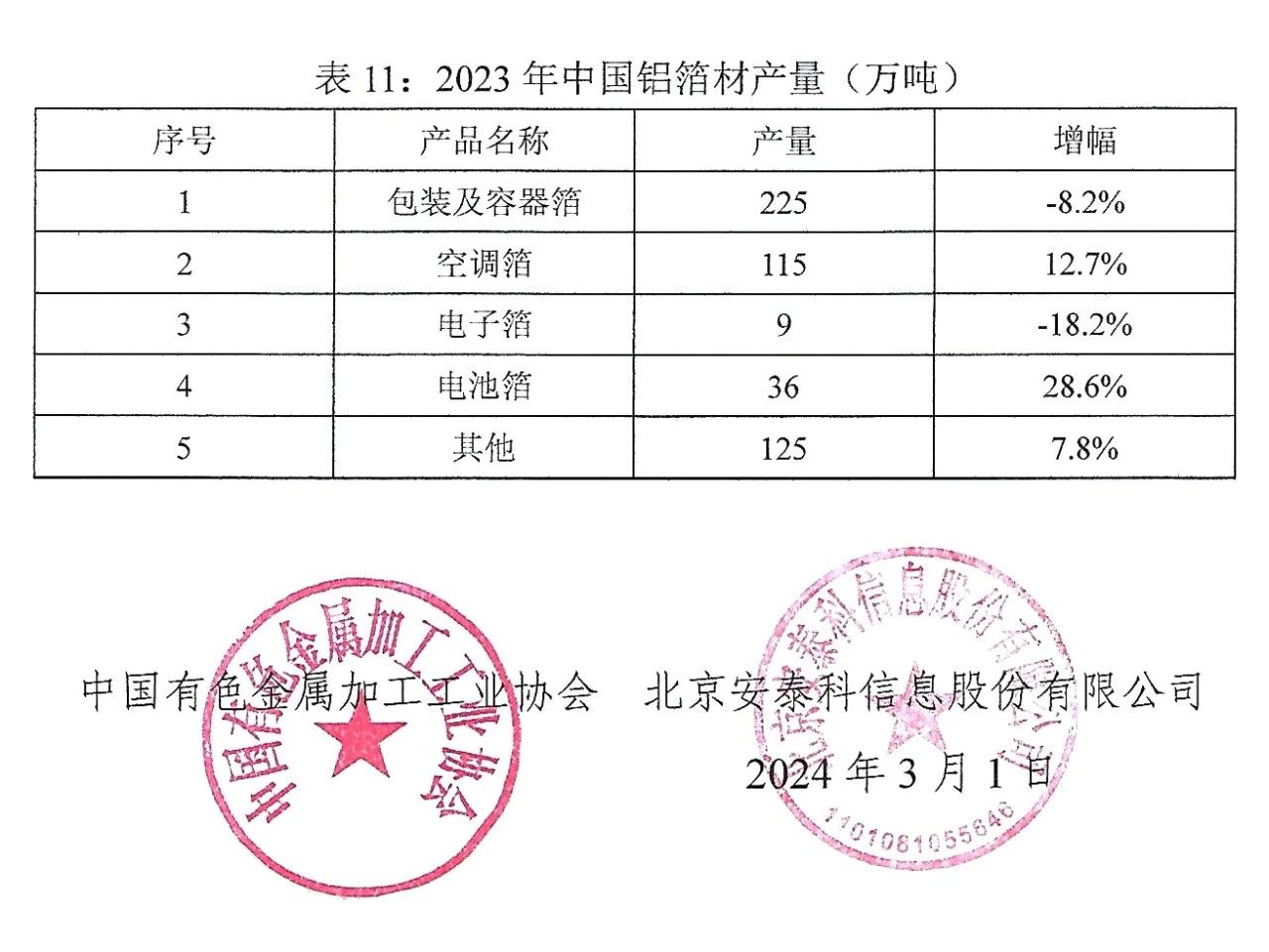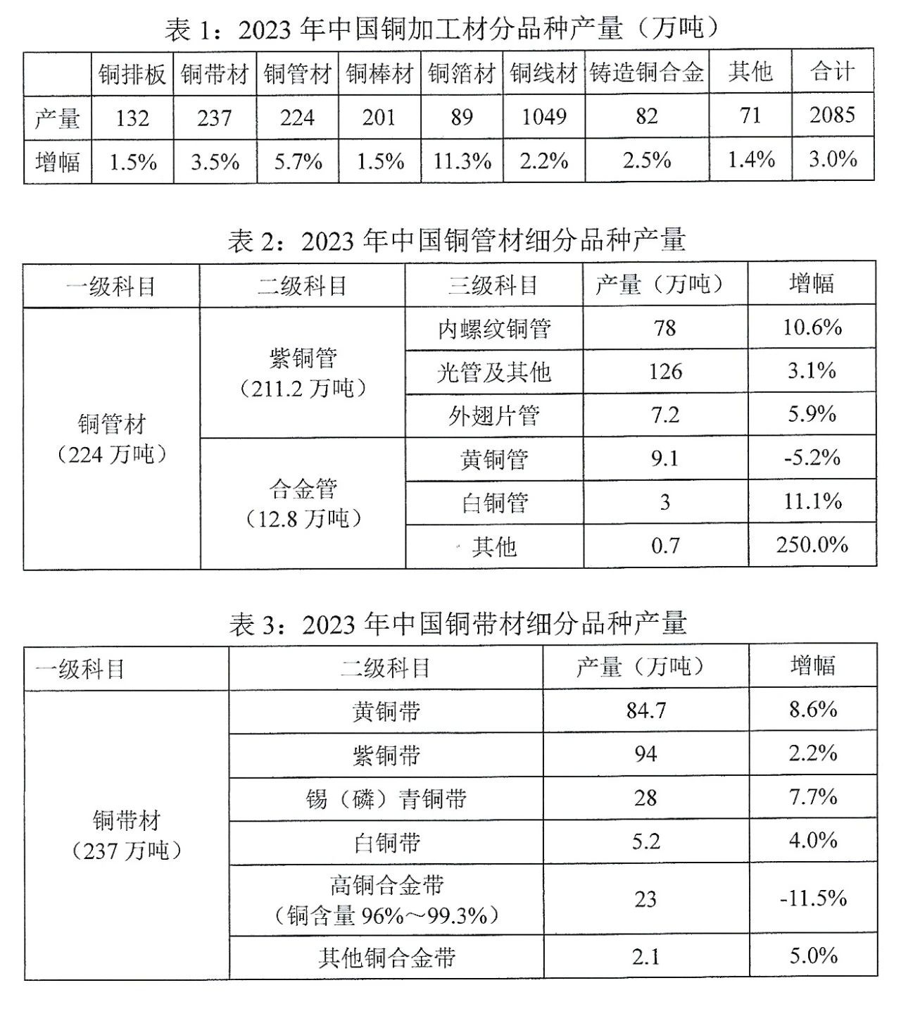 2023年,中國銅加工材綜合產(chǎn)量為2085萬噸,比上年增長3.0%。鋁加工材綜合產(chǎn)量為4695萬噸,比上年增長3.9%,其中剔除鋁箔坯料后的鋁加工材產(chǎn)量為4115萬噸,比上年增長4.2%。銅鋁加工材細分品種產(chǎn)量和鋁擠壓材表面處理方式構(gòu)成詳見下表1至表11。